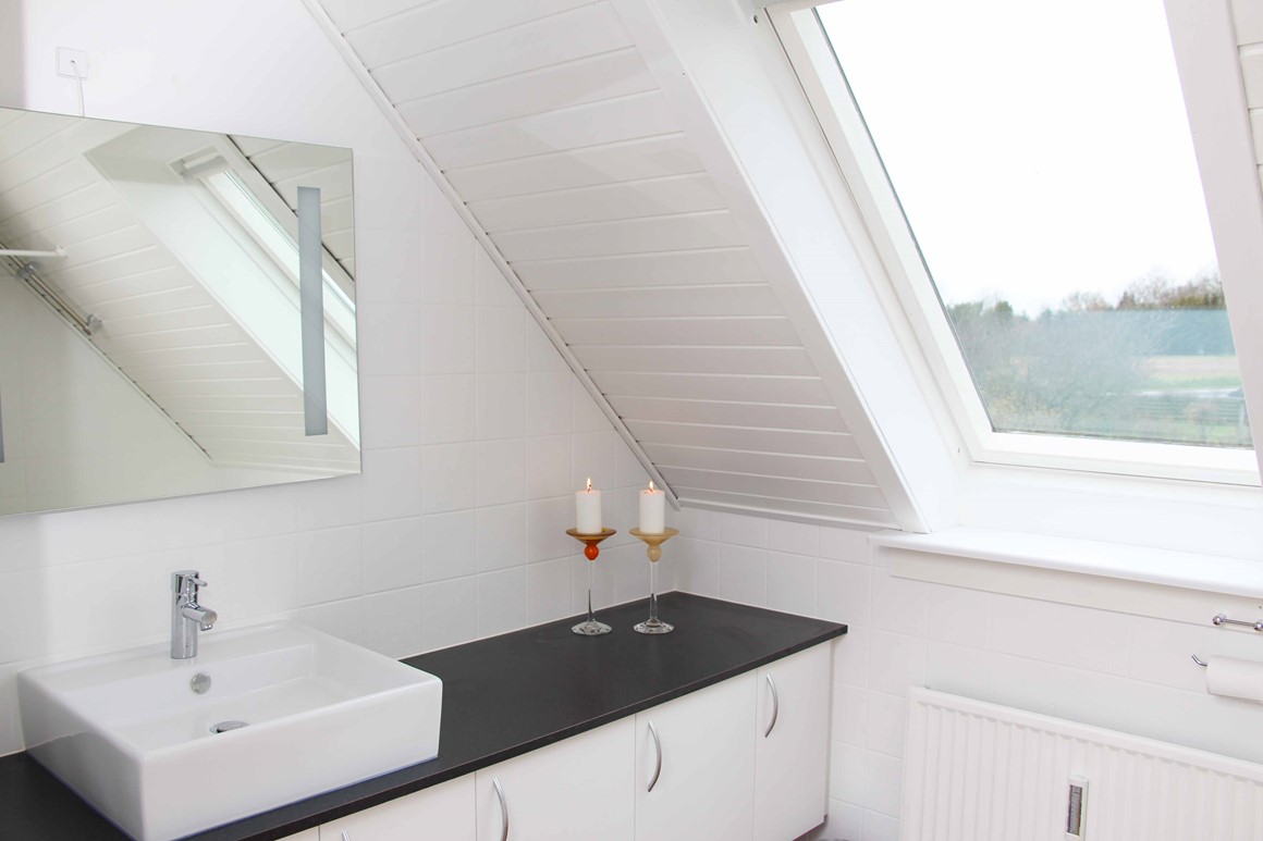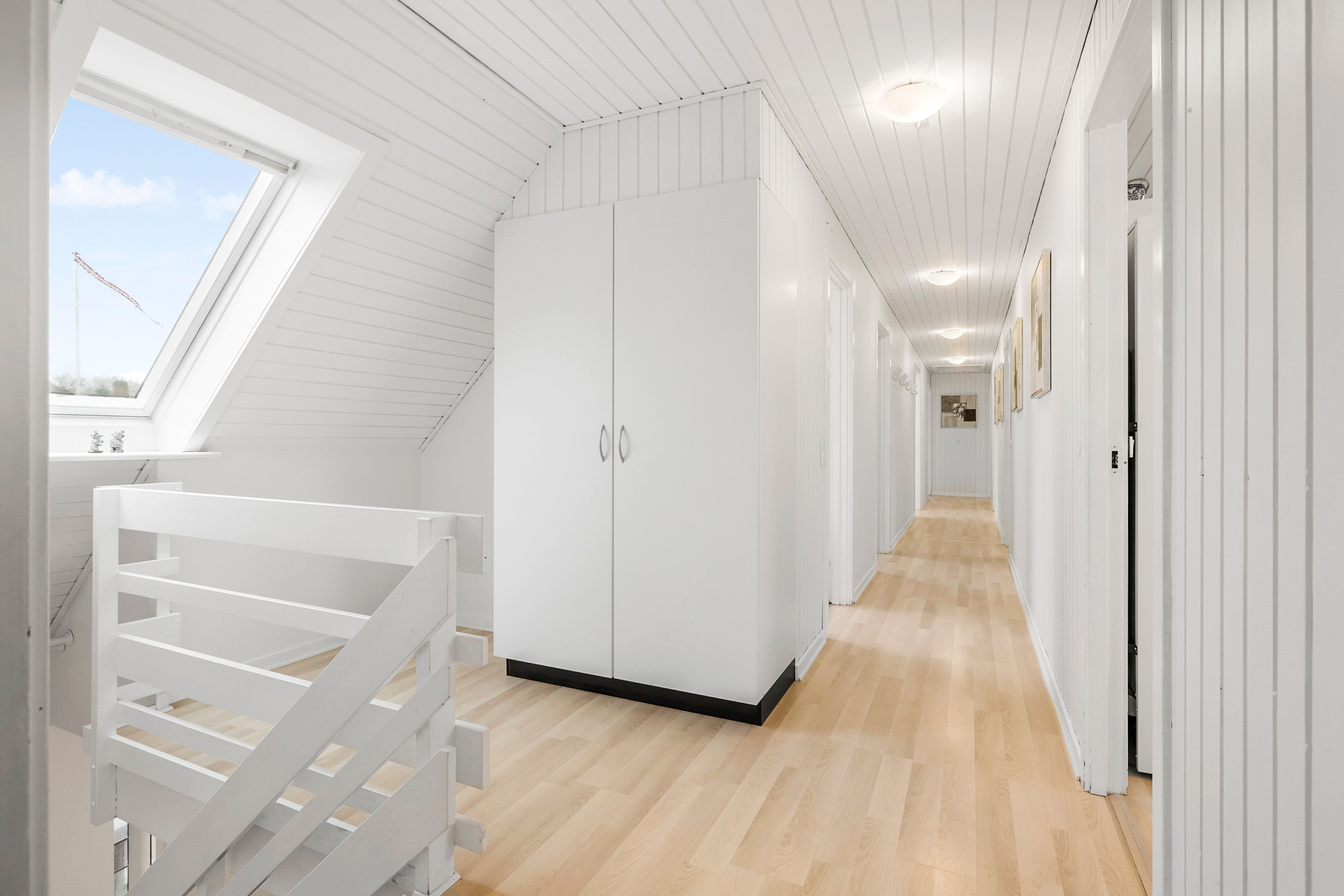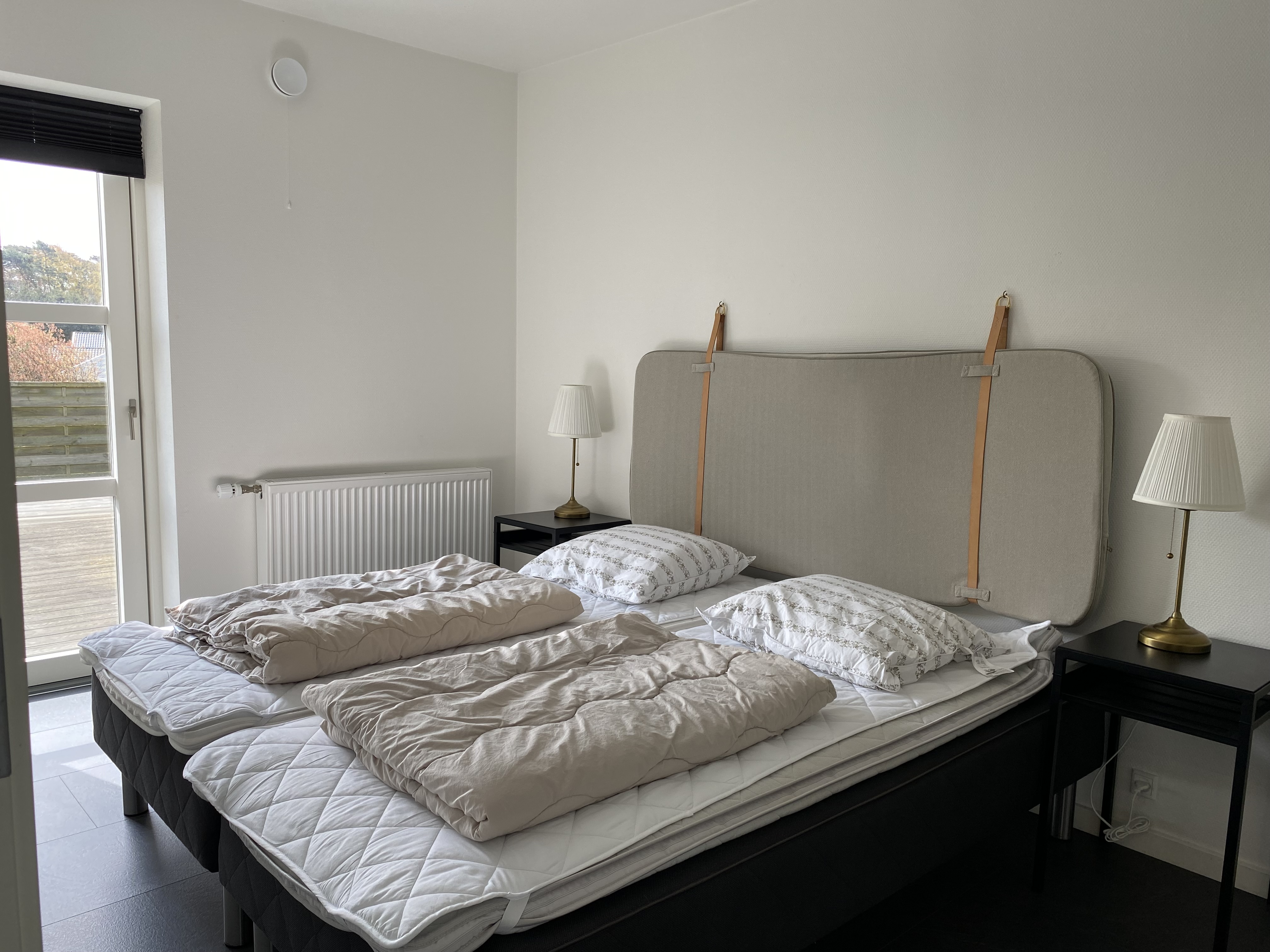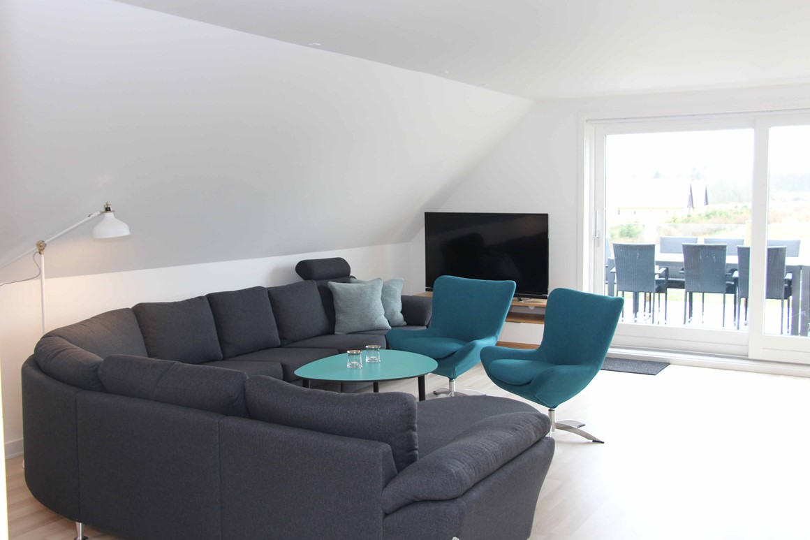Entre i stueplan, hvor en trappe går op til lejligheden, som er beliggende på 1. sal. På 1. sal er der stor stue med sofagruppe samt extra sofa (sovesofa med 2 sovepladser), tv og en stemningsfuld pejs. I stuen er der også spisebord med plads til 12 personer. Fra stuen har du udsigt over de bølgende kornmarker, ligesom du kan gå ud på den hævede terrasse med havemøbler og grill. I forlængelse af stuen finder du et veludstyret køkken med køleskab, komfur, opvaskemaskine samt spisebord med plads til 6 personer. Der er endvidere to badeværelser (hvor der er bruser/karbad i det ene badeværelse), vaskerum med vaskemaskine/tørretumbler, samt fire soveværelser. Lejlighedens samlede areal er 161 m2.
